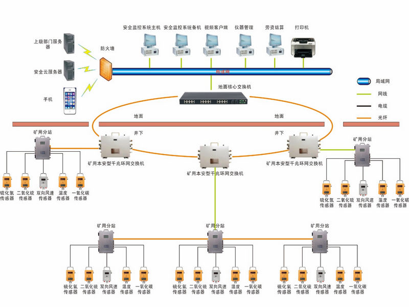 该系统不仅能够准确、及时地检测井下常规 的环境参数和设备运行状态,同时延展了监控范围,即可做到安全监控,对灾害进行早期预测、对事故进行必要的防患和处理,又可进行工作人员的管理和定位,并及时进行数据分析和统计,为生产调度提供准确与科学的数据,进而指挥生产,保障生产安全。系统实现了与人员管理系统、广播通信系统、有线调度系统在地面核心站的无缝结合,可实现四系统同屏显示、分屏显示、联动报警。
